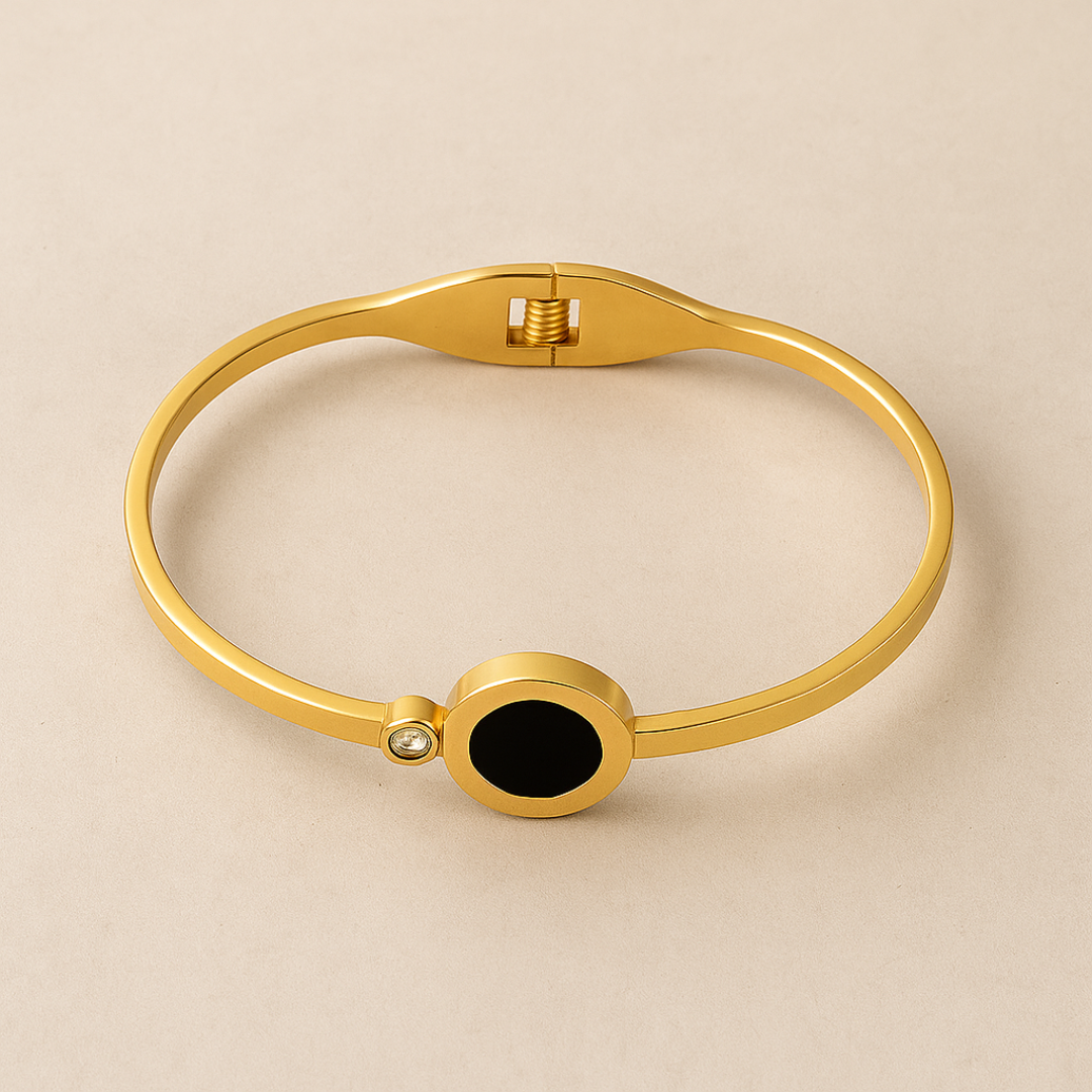 This sleek and stylish gold-toned bracelet is designed for women who love a touch of elegance in their everyday look. Featuring a bold black center with a sparkling crystal accent, this piece blends simplicity with luxury effortlessly.